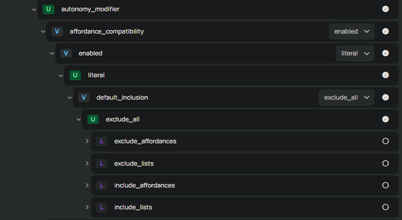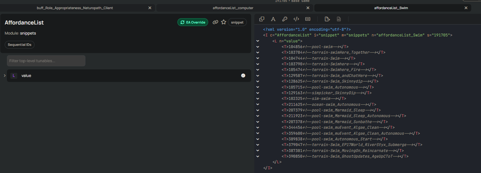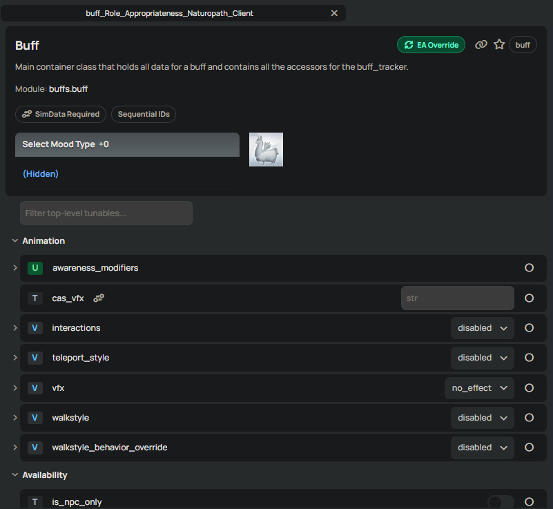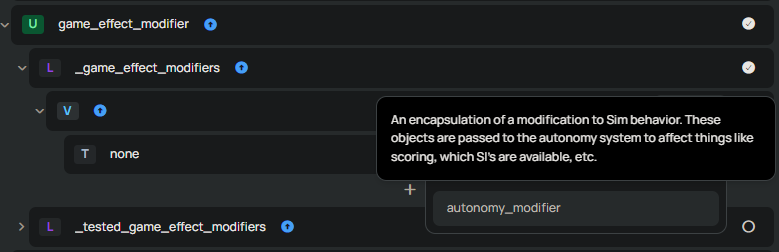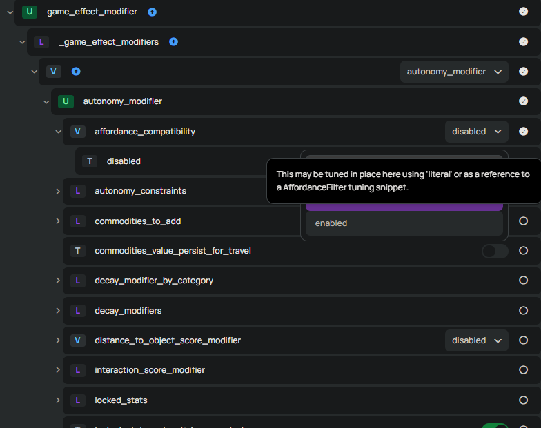 So, we know we need to edit the autonomy somehow. Well, that's a bit hidden in the menu, and I wish I could tell you I remember how I found it. I probably looked into another interaction. Either way, we can find what we need inside game_effect_modifier